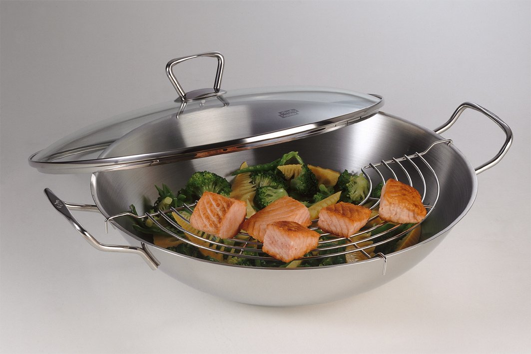 Ambitionierte Köche, die Wert auf Qualität und professionelle Zubereitung legen, greifen zum neuen Fissler Wok. Aber auch wer gerne experimentiert und gesellige Runden liebt, wird Freude beim Kochen mit dem neuen Wok erleben. Der Wok ist dank des Thermicbodens auf jedem Herd einsatzbereit. Die Griffe bleiben auch beim Kochen, Braten und Frittieren kalt und machen Topflappen überflüssig. Das Abtropfgitter dient als praktische Ablage oder hält Speisen während des Kochens warm. Auch das vitaminschonende Dämpfen von Gemüse sowie das Zubereiten von leckeren asiatischen Spezialitäten wie Teigtaschen ist mit dem Fissler Wok kein Problem. Ein als Zubehör erhältlicher Dämpfeinsatz macht's möglich.