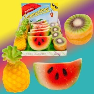 | Marzipanobst Tropical Fruit Inhalt 14 Stück Edelmarzipan je Stück 50 g Einzeln verpackt.In liebevoller Handarbeit in Deutschland hergestellt. Zutaten: Zucker, 39% Mandeln, Wasser, Feuchthaltemittel Sorbit, Invertase, Farbstoffe: E100, E120, E131, E153, E160a, E171, E904, Zuckerdekor mit Hühnereiweis, Kakaopulver (stark entölt).Produktinfo: Größe der Figuren aus unserem Gesamtsortiment: Gewicht bis 25 g ca. 4-5 cm, Gewicht bis 50 g ca. 7 cm, Gewicht 200 g - 410 g ca. 10-15 cm. | |