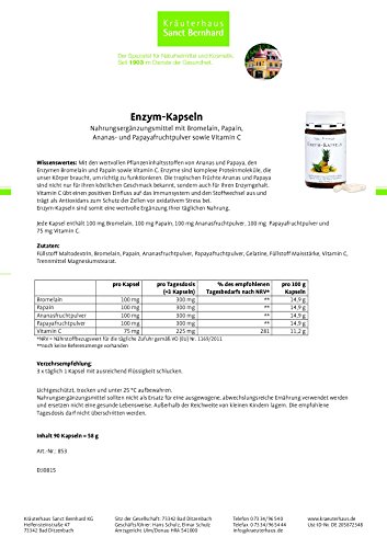 -. Feature : Mit den wertvollen Pflanzeninhaltsstoffen von Ananas und Papaya / Ananas und Papaya enhalten die Enzyme Bromelain und Papain / Vitamin C übt einen positiven Einfluss auf das Immunsystem und den Stoffwechsel aus / Jede Kapsel enthält 100 mg Bromelain, 100 mg Papain, 100 mg Ananasfruchtpulver, 100 mg Papayafruchtpulver und 75 mg Vitamin C.