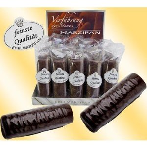 | Marzipanriegel 90/10er Edelmarzipanrolle/Schoko Inhalt 36 Stück Edelmarzipan je Stück 50 g Einzeln verpackt.In liebevoller Handarbeit in Deutschland hergestellt. Zutaten: Zucker, 49% Mandeln, Wasser, Feuchthaltemittel Sorbit, Invertase, Farbstoffe: E100, E120, E131, E153, E160a, E171, E904, Zuckerdekor mit Hühnereiweis, Kakaopulver (stark entölt).Produktinfo: Größe der Figuren aus unserem Gesamtsortiment: Gewicht bis 25 g ca. 4-5 cm, Gewicht bis 50 g ca. 7 cm, Gewicht 200 g - 410 g ca. 10-15 cm. | |