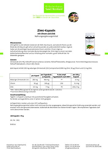 -. Feature : Ergänzt mit Spurenelementen Chrom und Zink / Chrom trägt zur Aufrechterhaltung eines normalen Blutzuckerspiegels bei / Zink trägt zu einem normalen Kohlenhydratstoffwechsel und zur Erhaltung einer normalen, guten Sehkraft bei / Jede Kapsel enthält 200 mg Zimtextrakt 10:1 = 2.000 mg Zimt sowie 3,5 mg Zink und 50 µg Chrom / Für Diabetiker geeignet